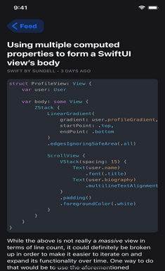 Enjoy reading about programming? Posts that include source code will get beautiful syntax highlighting in Harbor’s viewer.